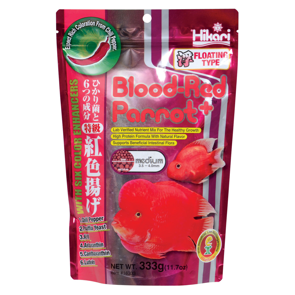 Hikari Blood-Red Parrot+ is a revolutionary daily diet developed to stimulate aggressive color enhancement in Red Parrot Fish. Formulated to bring out the full potential of this magnificent species, each floating pellet is packed with 6 highly effective color-enhancing ingredients, including chili pepper, phaffia yeast, krill, astaxanthin, canthaxanthin, and Lutein. Produces visible color improvement in as little as two weeks!